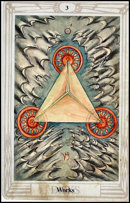 The Three of Disks. Constructivity. Building. Designing. Planning. Accomplishment. Competence. Teamwork. Cooperation. The Three of Disks corresponds to the Sefirot of Binah; understanding, the birthing ground, and the plane. The Three of Disks is where the energy of the Suit begins to come into itself and realize some of its potential; it is where the groundwork for the subsequent numbered cards in the suit, and provides a base for them to build off of. In the case of Disks, this card is Works; it represents great accomplishments finished through Teamwork and Cooperation, as well as Competent Planning and Design, resulting in something being Built. This card represents the practical wisdom of working together with others, reflecting the duality seen in the Sefirot of Binah, and the subsequent material benefits of this action.