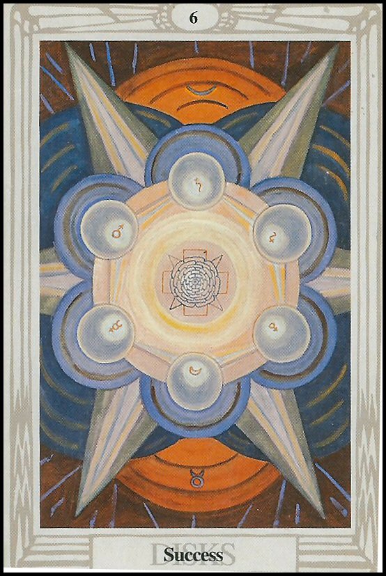 The Six of Disks. Success. Power. Wealth. Resources. Knowledge. Respect. Reward After Work. Inequality. Quiet Triumph. Reassessment. The Six of Disks corresponds to the Sefirot of Tiphareth; the Conscious Harmony of the suit of Disks and the element of Experience. Tiphareth represents the central balance of the Suit, being located at the center of the Tree of Life. This card, then represents the harmonious nature of the Suit of Disks, and that which is achieved through experience, taking both of the meanings of the Sefirot literally (as is in the spirit of Disks). When one with experience goes out into the world to live their life, what do they often manage to do? Achieve Success. This card represents what one might possess after achieving material and practical success; Wealth,Power, Resources, and Respect. It represents also the idea of receiving a Reward After Hard Work. It encompasses many of the previous themes of the Suit of Disks, and represents what one can expect if one works with the element of Earth under the guiding light of Kether. This card represents also a sort of Quiet Triumph; success can certainly be considered a triumph, but is rarely celebrated like a military victory would be. The kind of triumph this card represents is the more common form of triumph in the real world; that of living comfortably after hard work.